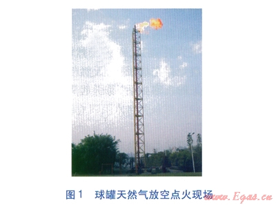 先將球罐內(nèi)天然氣壓力降至與城市燃?xì)夤芫W(wǎng)壓力一致,通過(guò)儲(chǔ)配站中的點(diǎn)火塔將球罐內(nèi)余氣燃燒掉,直至球罐內(nèi)天然氣壓力與大氣平衡,再打開(kāi)球罐上下入孔蓋。球罐天然氣放空點(diǎn)火現(xiàn)場(chǎng)見(jiàn)圖1。