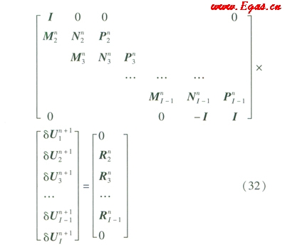 因此,本文采用延長(zhǎng)初始時(shí)刻和延長(zhǎng)出口點(diǎn)數(shù),即在第一時(shí)刻之前補(bǔ)充一個(gè)l時(shí)刻,其各參數(shù)均與初始時(shí)刻保持一致;管道出口點(diǎn)在原來(lái)出口點(diǎn)的基礎(chǔ)上增加一個(gè)點(diǎn),即I點(diǎn),該點(diǎn)參數(shù)將與出口點(diǎn)保持完全一致。由于這樣并未改變?cè)瓉?lái)管道的運(yùn)行參數(shù)和條件,所得結(jié)果也與原來(lái)求解結(jié)果一致。這樣可構(gòu)成一個(gè)三對(duì)角方程組,如下: