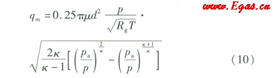 泄漏點(diǎn)處氣流處于亞臨界泄漏階段,管道泄漏率方程為式(10) [5]