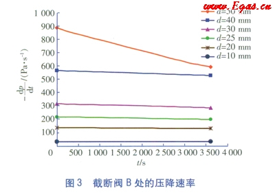 根據(jù)上述條件計(jì)算,在不同泄漏點(diǎn)孔徑d下,截?cái)嚅yB處的壓降逮率情況,計(jì)算結(jié)果見(jiàn)圖3,圖中計(jì)算起始時(shí)間為3s
