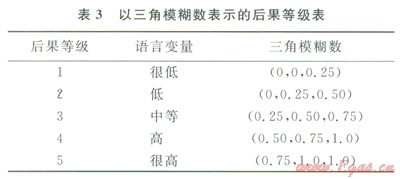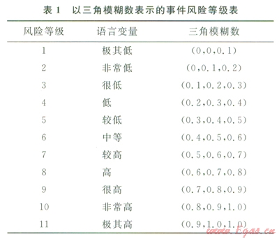 將引起燃?xì)夤艿佬孤┦录L(fēng)險分為11個等級[8],相應(yīng)的語言變量及模糊數(shù)參照表l,語言變量可直觀表達(dá)風(fēng)險因素的相對重要性。