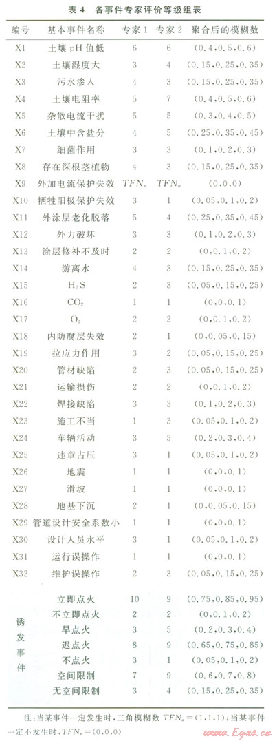 首先邀請有經(jīng)驗的專家組成評價小組,冉對專家進(jìn)行權(quán)重分析,本文僅以兩位專家為例,并且賦予其相等的權(quán)重。依據(jù)故障樹中基本事件和事件樹中誘發(fā)事件的風(fēng)險大小,由號家賦予每個事件相應(yīng)的三角模糊數(shù),評價結(jié)果見表4,然后根據(jù)式(5)求得聚合后的事件模糊數(shù)。