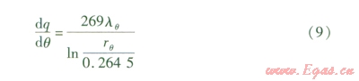 由邊界條件:當(dāng)r=0.2645m時(shí),微元弧面溫度為270℃;當(dāng)r= rq時(shí),微元弧面溫度為l℃,可求得式(8)在dq內(nèi)的解為: