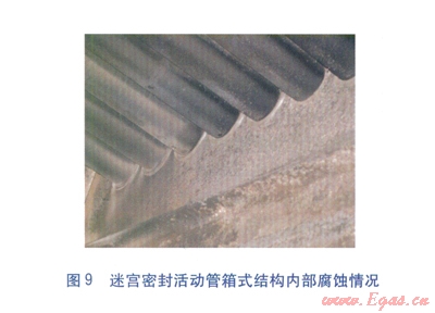經(jīng)研究,認(rèn)為采用非金屬材料的迷宮密封結(jié)構(gòu)可以有效消除縫隙腐蝕的發(fā)生,迷宮密封活動管箱式結(jié)構(gòu)見圖7。鍍搪瓷鋼管穿入迷宮密封套中(內(nèi)環(huán)面加工有迷宮鋸齒槽),迷宮鋸齒槽與鋼管外表面形成若干道迷宮腔,從而實現(xiàn)了密封。迷宮密封活動管箱式結(jié)構(gòu)不但具有端面填料函密封的活動管箱式結(jié)構(gòu)的優(yōu)點,還由于換熱管與箱體板之間有柔性迷宮密封套隔離,避免了在安裝、運行過程中對搪瓷層的破壞,從本質(zhì)上消除了縫隙腐蝕的發(fā)生[5]。經(jīng)技術(shù)改造后的空氣預(yù)熱器,連續(xù)運行2年后運行狀況依然良好,箱體板及換熱管各部位基本上沒有發(fā)生腐蝕(見圖8、9)。