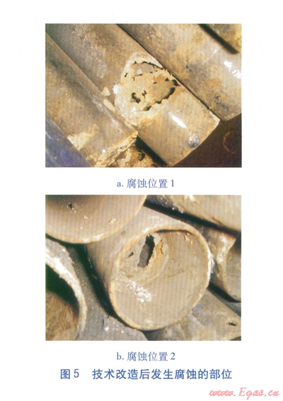 按單純改善換熱管材質(zhì)考慮,當(dāng)換熱管采用20號鋼時,一組管箱(整體焊接的固定管箱式結(jié)構(gòu))的制造安裝費用為2.85×104元。當(dāng)換熱管采用ND鋼時,一組管箱(整體焊接的固定管箱式結(jié)構(gòu))的制造安裝費用為6.96×104元。后者的制造安裝費用為前者的2.44倍,但使用壽命并未明顯延長,最長為5~10個月。