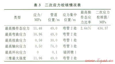 3)一次應(yīng)力占管道綜合應(yīng)力的97.12%,故占管道應(yīng)力的大部分。同時(shí),在管道自重對(duì)一次應(yīng)力影響的校核中,管道自重占一次應(yīng)力的8.9%,所占比例較小。因此,管道內(nèi)壓是產(chǎn)生一次應(yīng)力的主要因素。在一次應(yīng)力校核中發(fā)現(xiàn)應(yīng)力集中點(diǎn)在管道彎管3處,由于一次應(yīng)力反映的是管道內(nèi)壓和管道以及管內(nèi)介質(zhì)的自重對(duì)管道應(yīng)力的影響,因此,在試壓工況下,影響管道應(yīng)力的最主要因素是管道內(nèi)壓。