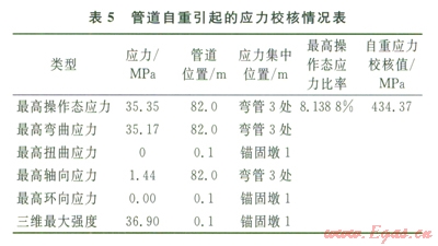 由表2~5可知,最高操作態(tài)綜合應(yīng)力產(chǎn)生在管道彎管3處,管道系統(tǒng)單元l70~180即管道76~82m處的最高操作態(tài)應(yīng)力為397.46MPa,最高操作態(tài)應(yīng)力比率為91.5034%,綜合應(yīng)力主要產(chǎn)生在彎管3處,一次、二次應(yīng)力及綜合應(yīng)力校核最高節(jié)點(diǎn)應(yīng)力均未超過(guò)434.37MPa,滿(mǎn)足管道的強(qiáng)度和柔性要求。