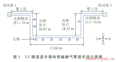 根據(jù)XX隧道穿越管道設(shè)計(jì)資料,隧道穿越的總長(zhǎng)度為2246.7m,隧道內(nèi)全部采用露空與管架支撐形式,在隧道進(jìn)口和出口處分別設(shè)置錨固墩l和錨固墩3,用以截?cái)嗨淼劳夤艿缹?duì)隧道內(nèi)管道的影響。隧道進(jìn)口豎井深度為26.87m,支吊架2個(gè)(第1個(gè)支吊架距隧道進(jìn)口處5.4m),2個(gè)支吊架間距為2.816m;平巷長(zhǎng)度為2160m,平巷內(nèi)設(shè)置支墩,支墩間距為l2m,共設(shè)置支墩l81個(gè);隧道出口豎井深度為18.32m,支吊架l個(gè)(距隧道出口處6.624m);管道彎管處的曲率半徑為6D(D為管道外徑)。管道的材料為L485,管徑為914mm,壁厚為22.2mm,彎管壁厚為23.8mm。根據(jù)式(1)計(jì)算得到試驗(yàn)壓力(pt)為21.2MPa。XX隧道豎井盾構(gòu)穿越輸氣管道具體布局如圖1所示。