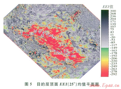 圖5為從反演得到的EEI(25°)屬性沿目的層頂面開l0ms時窗提取的算術(shù)平均值平面圖,圖中綠色到紅色對應(yīng)EEI值小于-l50,并且顏色從綠色到紅色對應(yīng)的EEI值逐漸降低。結(jié)合本區(qū)的鉆井情況和構(gòu)造形態(tài)可知,圖5中紅色異常范圍(即EEI值小于-150的范圍)與該層鉆井證實的含氣范圍吻合好。在EEI屬性平面圖上,鉆遇水層的E9井處EEI屬性表現(xiàn)為水層特征,而其他含氣性好的井則對應(yīng)相對低的EEI值,這說明利用EEI屬性能有效地區(qū)分出氣層和水層。另外,A9井區(qū)物性較好的位置主要集中在構(gòu)造高部位,即A9井的周圍,但是分布的范圍較小,這可能就是A9井生產(chǎn)過程中壓力下降較快的一個原因。