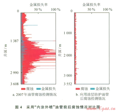 結(jié)果表明:應(yīng)用DPC內(nèi)涂層+外雙金屬?gòu)?fù)合噴涂技術(shù)油管后,檢測(cè)發(fā)現(xiàn)油管內(nèi)壁腐蝕輕微,最大腐蝕量控制在本體的l0%以內(nèi),腐蝕速率最大為0.11mm/a。通過前后兩種氣井管柱腐蝕狀況對(duì)比,發(fā)現(xiàn)該油管防腐效果良好。截至目前,該井油管使用時(shí)間已超過5年,生產(chǎn)正常。
