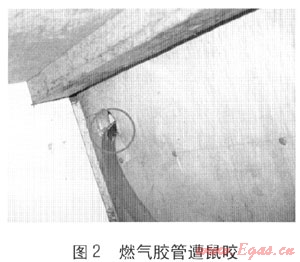 2010年11月5日,溫州市區(qū)康泰大廈一住戶廚房內(nèi)發(fā)生一起燃氣爆炸事故,造成1人受傷、2戶建筑受損,爆炸原因系老鼠咬破膠管引發(fā)燃氣泄漏。膠管被鼠咬是用戶家中安全用氣的最大隱患之一,每年冬春兩季鼠患最為嚴重。統(tǒng)計數(shù)據(jù)顯示,2009年公司供氣區(qū)域內(nèi)發(fā)生230起有關(guān)膠管隱患處警,其中膠管被鼠咬有76起;2010年共發(fā)生有關(guān)膠管隱患處警200起,其中膠管被鼠咬有93起,進而發(fā)生爆燃的有5起。通常用戶家里所使用的燃氣膠管為橡膠軟管,易被鼠咬(見圖2),用戶在不知道的情況下開啟灶具開關(guān)就會產(chǎn)生爆炸、爆燃等事故。