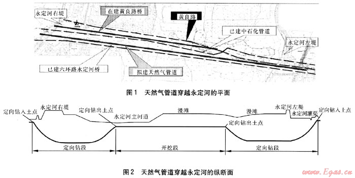 天然氣管道穿越永定河的平面及縱斷面見圖1、2。