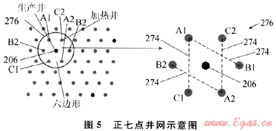圖7為加熱井的另外一種陣列形式。在同心環(huán)形式的體積中,隨著環(huán)形體積向外移動(dòng)其周長(zhǎng)逐漸增大。所以間插加熱可減少外環(huán)體積的地層熱膨脹。