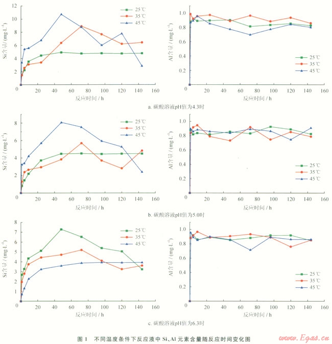 配制pH值分別為4.3、5.0、6.3的碳酸溶液,使用精密天平稱取質(zhì)量為2.0000g的伊利石礦物,將礦物放入惰性的塑料反應(yīng)瓶中,按照1:15固/液比(g/mL)加入不同pH值的碳酸溶液,輕微搖晃后密封,放入恒溫箱中,模擬現(xiàn)場儲層溫度,把反應(yīng)溫度分別設(shè)置為25℃、35℃和45℃,反應(yīng)不同的時間后(1h、4h、9h、24h、48h、72h、96h、120h、144h),將E清液過濾,對濾液中的Si、Al元素含量進行測試。測試方法分別為鉬酸比色法和鉻天青比色法[17],測試儀器為上海佑科721型分光光度計,使用D8ADVANCE型X射線衍射儀測試分析與碳酸反應(yīng)前后伊利石礦物晶體結(jié)構(gòu)的變化。
