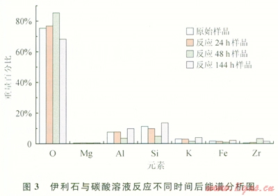 從表5和圖3中可以看出,固相礦物質(zhì)中隨反應(yīng)時間增加Si、Al元素均呈現(xiàn)出“先減小后增加”的趨勢,但Al元素含量變化較小,si元素含量在48h時最低,在144h時si元素含量升高。這與反應(yīng)液中si、A1元素含量的變化相一致;固相中Mg、K、Fe、Zr元素含量隨反應(yīng)時間增加呈現(xiàn)出減小的趨勢,說明Mg、K、Fe元素發(fā)生了溶解;固相O元素隨反應(yīng)時間增加先增加后減小,這可能是由于O元素溶出量小于其他元素溶出量大,導(dǎo)致相對含量增加,在144h時Si元素等沉淀,導(dǎo)致其相對含量降低。