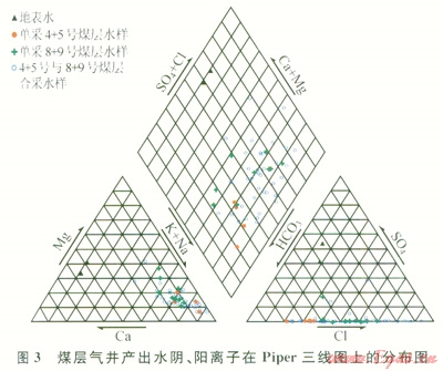 如圖3所示,不同地區(qū)煤層氣井產(chǎn)出水陰、陽離子在Piper三線圖上的分布較離散。北部地區(qū)煤層氣井產(chǎn)出水以K+、Na+、Cl-和HCO3-為主,Ca2+、Mg2+含量較低,SO42-含量極少,與地表水離子組成差異較大,說明該區(qū)遠離補給區(qū);而東南部地區(qū)煤層氣井產(chǎn)出水K+、Na+、Cl-含量較北部低,Ca2+、Mg2+含量略高于北部地區(qū)、SO42+含量較北部地區(qū)高,與地表水相似程度較高,說明該區(qū)靠近補給區(qū)。另外,該區(qū)產(chǎn)出水呈弱堿性,pH值介于7.1~8.3,平均值為7.8,不同地區(qū)差異較小。