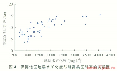 該區(qū)煤層氣井產(chǎn)出水礦化度總體較低,介于842~5072mg/L,平均為1750mg/L,總體變化趨勢由東向西、由南向北礦化度增加(圖2)。由于該區(qū)構造為西傾單斜,地下水總體流向為由東向西,隨著距離露頭區(qū)距離的增加,地層水礦化度增高(圖4)。北部開發(fā)區(qū)距離補給區(qū)較遠,而南部距離補給區(qū)較近,因此,南部地層水礦化度小于北部,水動力條件南部較北部活躍。