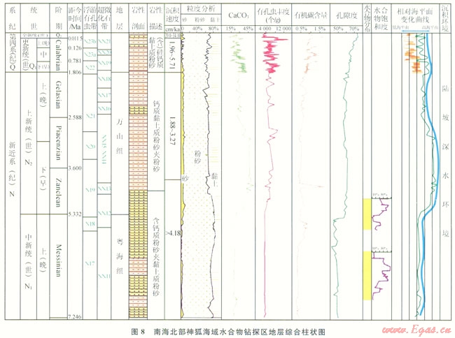 南海北部陸坡水合物主要富集在晚中新世以來的海相沉積物中,分布深度和層位深淺不一。通過對神狐鉆孔巖心分析,根據(jù)生物地層帶對比劃分標(biāo)準(zhǔn)[25],水合物層分布在NNl2-NNl6和NNll帶,分別對應(yīng)為上新統(tǒng)下部和上中新統(tǒng)(圖8)。從區(qū)域性沉積相分析,晚中新世以來南海北部陸坡區(qū)沉積演化具有明顯的繼承性,早期為濱海淺海深海的沉積環(huán)境,后期主要為半深海和深海沉積環(huán)境,陸坡沉積物總體巖性偏細(xì)。但是在臺西南盆地、珠江口盆地白云凹陷以及瓊東南盆地,局部發(fā)育了等深流、濁積扇、滑塌沉積、陸坡水道等沉積體系,由于沉積速率高、沉積物偏粗、有機(jī)碳含量較高,有利于水合物富集成藏(圖9)。