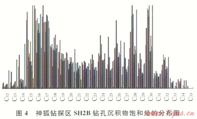 在南海北部陸坡淺表層沉積物有機(jī)質(zhì)中正構(gòu)烷烴基本為雙峰形,表現(xiàn)為海相浮游動物、陸源高等植物混合母源特征。神狐鉆孑L沉積物有機(jī)質(zhì)正烷烴為雙峰形分布特征(圖4)。第一主峰碳數(shù)為C17~C19,代表海相浮游動物和藻類,第二主峰碳數(shù)為C29或C31來源于陸源高等植物。其輕重?zé)N比值C21-/C22+介于0.06~5.73,有機(jī)質(zhì)d13C值為-17.3‰~-22.8‰,表明總體上以海相浮游動物和藻類為主,局部存在陸源有機(jī)質(zhì)。鉆孔沉積物TOC介于0.29%~1.77%,各鉆孔頂部層段TOC明顯表現(xiàn)出在高值區(qū)振蕩變化特征,并隨深度的增加TOC值逐漸降低,而到一定深度后,TOC基本保持穩(wěn)定(圖5)。這種有機(jī)碳系統(tǒng)地向下減少是早期成巖階段有機(jī)質(zhì)氧化分解的結(jié)果[17]。由于鉆孔淺部沉積物埋藏時間短,有機(jī)質(zhì)消耗較少,TOC與沉積物中原始含量比較接近,平均值達(dá)1.2%;而下部層段的有機(jī)碳為經(jīng)過早期成巖階段硫酸鹽還原和微生物發(fā)酵而大量消耗后的穩(wěn)定殘留有機(jī)碳,有機(jī)碳轉(zhuǎn)化率在30%~61%,大多轉(zhuǎn)化為生物甲烷氣,是形成水合物的主要?dú)怏w來源。神狐鉆孔沉積物有機(jī)質(zhì)中含有豐富的烷基苯系列化合物,以短鏈的烷基苯同系物優(yōu)勢為特征,含少量對熱演化敏感的較長鏈的烷基苯同系物,表明有機(jī)質(zhì)熱演化程度很低。此外,部分樣品中存在重排甾烷和4-甲基甾烷,是典型的微生物作用活動標(biāo)志,這與鉆探證實(shí)的水合物主要為微生物氣特征是一致的。