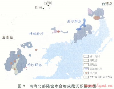 2)南海北部陸坡從西部 中部一東部體現(xiàn)出不同的地質(zhì)構(gòu)造特點(diǎn),其強(qiáng)烈差異性對水合物的富集成藏產(chǎn)生深刻的影響。東部以臺西南盆地北緣成藏條件最為優(yōu)越,水合物主要通過氣體的垂向與側(cè)向結(jié)合運(yùn)聚方式成藏,為復(fù)合型水合物發(fā)育的有利區(qū);中部以珠江口盆地白云凹陷南坡為代表,水合物主要通過氣體的側(cè)向運(yùn)聚模式成藏,驅(qū)動力受淺層流體勢控制明顯,為分散型水合物發(fā)育區(qū);西南部以瓊東南盆地的深水帶成藏條件優(yōu)越,新近紀(jì)來構(gòu)造沉降速率較大,沉積厚度大,泥底辟和氣煙囪體發(fā)育,對水合物成藏控制明顯,水合物主要通過氣體的垂向運(yùn)聚模式成藏,有利于發(fā)育滲漏型水合物藏。