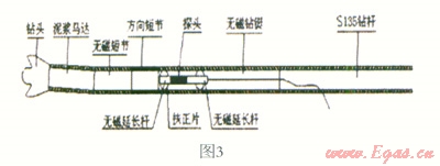 本次采用有線控向系統(tǒng),井下鉆具組合主要由鉆頭、帶彎外殼的螺桿馬達、泥漿壓力傳感器、控向探棒(兩端帶扶正器)和無磁鉆鋌組成,其中控向探棒安裝在無磁鉆鋌內部。如圖3: