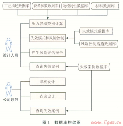 系統(tǒng)的設(shè)備工藝描述、設(shè)計(jì)參數(shù)、介質(zhì)特性、材料等基礎(chǔ)數(shù)據(jù)庫(kù)用于設(shè)計(jì)人員進(jìn)行壓力容器類別的計(jì)算,然后從失效模式數(shù)據(jù)庫(kù)、風(fēng)險(xiǎn)措施數(shù)據(jù)庫(kù)調(diào)用數(shù)據(jù)開(kāi)展失效模式和風(fēng)險(xiǎn)控制判別,參照失效案例,產(chǎn)生壓力容器設(shè)計(jì)階段的風(fēng)險(xiǎn)評(píng)估報(bào)告,提交公司主管領(lǐng)導(dǎo)審核。上級(jí)公司主管領(lǐng)導(dǎo)在系統(tǒng)中進(jìn)行審核,必要時(shí)也能方便地調(diào)用失效案例數(shù)據(jù)進(jìn)行復(fù)核(1)