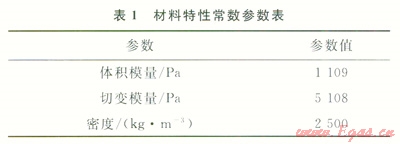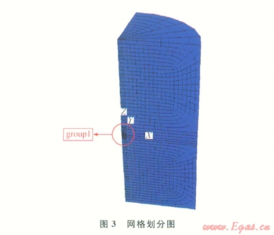 圖3中,1/4圓柱體模擬儲(chǔ)氣庫溶腔周圍的地質(zhì)環(huán)境,其直徑是儲(chǔ)氣庫溶腔模型最大直徑的20倍,在網(wǎng)格中間位置可以看到儲(chǔ)氣庫溶腔輪廓的1/4。在網(wǎng)格劃分時(shí)將儲(chǔ)氣庫溶腔網(wǎng)格一起劃分,有助于儲(chǔ)氣庫溶腔的形成。在此網(wǎng)格中,定義了2個(gè)組,分別是group1和group2,前者對儲(chǔ)氣庫溶腔進(jìn)行網(wǎng)格劃分,后者對儲(chǔ)氣庫溶腔周圍地質(zhì)環(huán)境進(jìn)行網(wǎng)格劃分。選擇采用各向同性彈性模型,其材料特性常數(shù)見表1。