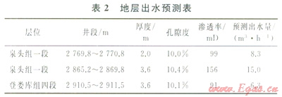 鉆至2900m(2870m進(jìn)入登婁庫組四段),扭矩開始發(fā)牛波動(dòng),預(yù)計(jì)鉆達(dá)第3個(gè)水層(表2)。2914m接立柱后恢復(fù)鉆進(jìn)時(shí)返出氣體潮濕,判斷接換立柱時(shí)井下已經(jīng)出水。循環(huán)30min后粉塵返出,現(xiàn)場(chǎng)繼續(xù)采用氣體鉆井,鉆時(shí)3~15min/m。