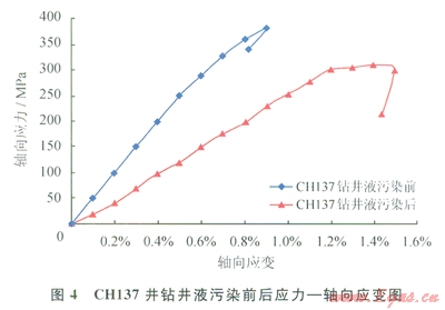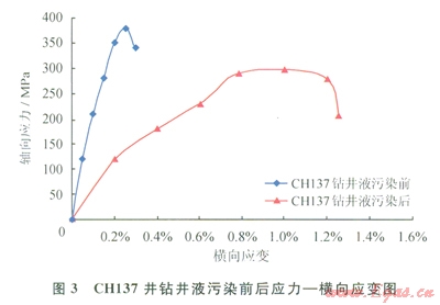 地層條件下,鉆井液浸泡對(duì)巖石三軸力學(xué)參數(shù)有較大影響(圖3、4)。由圖3、4可以看出,在50MPa壓力下,巖樣經(jīng)過5d、10d的鉆井液浸泡后,巖石抗壓強(qiáng)度和彈性模量顯著下降,而泊松比增大(CHl37井鉆井液浸泡前泊松比為0.28;鉆井液浸泡后泊松比為0.67),使得巖石破裂時(shí)橫向變形和軸向變形增加,增加了巖石抵抗破裂的能力。表明泊松比增加,巖石破裂壓力增加。