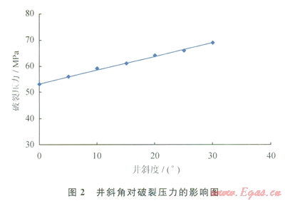 在鉆井過程中,若井眼方向與地層垂向應(yīng)力方向不平行,會(huì)導(dǎo)致壓裂施工時(shí)破裂壓力偏高(圖2)。由圖2可見,隨著井斜角增加,破裂壓力相應(yīng)增加。元壩陸相有些井是斜井或水平井,也是引起儲(chǔ)層高破裂壓力的原因之一。如YB2-側(cè)1井珍珠沖組一須二段下層、YL6井須二段、YL10井珍珠沖組和須二段、YL601H井須二段、YL701井須三段上層等,這些井都是斜井或水平井,井斜也引起破裂壓力明顯升高,破裂壓力梯度為0.027~0.037MPa/m。