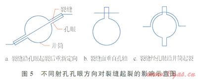 當(dāng)孔眼與最佳平面有一定夾角時(shí),夾角越大,破裂壓力越高,裂縫從孔眼處起裂的機(jī)會(huì)就越小,若裂縫不從孔眼處起裂,將出現(xiàn)圖5的情況而顯著增加破裂壓力。