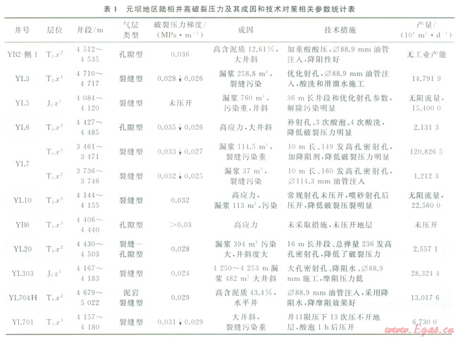 表1是元壩地區(qū)陸相已改造井破裂壓力及其成因和降低地層破裂壓力技術(shù)措施現(xiàn)場(chǎng)應(yīng)用效果的相關(guān)參數(shù)統(tǒng)計(jì)表。由表1可見,儲(chǔ)層破裂壓力梯度普遍偏高,大多在0.026~0.037MPa/m范圍。