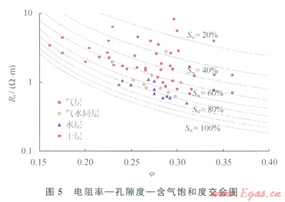 式(6)、(7)分別為孔隙結(jié)構(gòu)指數(shù)(m)和飽和度指數(shù)(n)的計(jì)算公式,利用修正的阿爾奇公式計(jì)算Sw,并建立電阻率孔隙度 含氣飽和度交會(huì)圖,能夠較好地識(shí)別氣水層(圖5)。