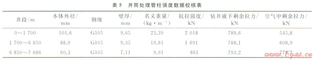 考慮到井筒條件,只能采用Gl05鋼級(jí)的Æ101.6mm、Æ88.9mm、Æ73.0mm/Æ60.3mm新鉆桿進(jìn)行通井作業(yè)。其參數(shù)及強(qiáng)度校核如表5所示。