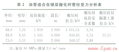 根據(jù)抗管柱在酸壓、生產(chǎn)過(guò)程中的強(qiáng)度校核,最大限度地降低生產(chǎn)成本,油管柱選擇125鋼級(jí)Æ88.9mm×7.34mm+Æ88.9mm×6.45mm+Æ73mm×5.51mm復(fù)合油管。