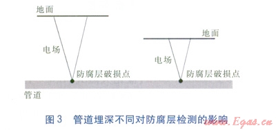 一般地,城鎮(zhèn)燃?xì)夤艿栏魈幝裆畈煌2煌墓艿缆裆顚Ψ栏瘜悠茡p點(diǎn)處泄漏電流產(chǎn)生的電場產(chǎn)生很大影響。假設(shè)管道防腐層的破損情況相同、周圍土壤電阻率變化不大,當(dāng)管道埋深較小時,從防腐層破損點(diǎn)向外傳導(dǎo)的電流相對集中,在地面上檢測到的電流較大;而當(dāng)管道埋深較大時,在地面上檢測到的電流較小(見圖3)。