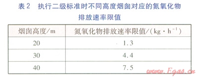 根據(jù)GB 3095—1996《環(huán)境空氣質(zhì)量標(biāo)準(zhǔn)》規(guī)定,該項目所在地為二類區(qū)(城鎮(zhèn)規(guī)劃中確定的居住區(qū)、商業(yè)交通居民混合區(qū)、文化區(qū)、一般工業(yè)區(qū)和農(nóng)村地區(qū)),應(yīng)執(zhí)行二級標(biāo)準(zhǔn)。根據(jù)GB 16297—1996規(guī)定,執(zhí)行二級標(biāo)準(zhǔn)時不同高度煙囪對應(yīng)的氮氧化物排放速率限值見表2。