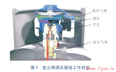 直立閥結(jié)構(gòu)見圖3,直立閥調(diào)壓器組工作狀態(tài)見圖4。與角閥相比,直立閥無(wú)外部手動(dòng)開關(guān),借助內(nèi)部彈簧與鋼瓶?jī)?nèi)壓自動(dòng)關(guān)閉。直立閥通常處于自動(dòng)關(guān)閉狀態(tài),只有裝上調(diào)壓器,并打開開關(guān),直立閥才能開啟。