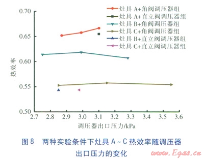 以直立閥鋼瓶作為氣源的實(shí)驗(yàn)方法為:選取鋼瓶?jī)?nèi)壓為0.03MPa,進(jìn)行灶具熱效率實(shí)驗(yàn)。待灶具燃燒穩(wěn)定后,將盛裝一定水的鋁鍋放于灶具上,待水溫升至高于初始溫度5℃時(shí),開始攪拌,并計(jì)量燃?xì)夂牧?。待水溫比初始溫度?span lang="EN-US">30℃時(shí),關(guān)閉灶具。實(shí)驗(yàn)數(shù)據(jù)經(jīng)過(guò)計(jì)算,可以得到灶具的熱效率[3]。以角閥鋼瓶作為氣源的實(shí)驗(yàn)方法為:在LPG鋼瓶滿瓶條件下,分別將調(diào)壓器調(diào)至最大壓力(對(duì)應(yīng)調(diào)壓器最大刻度)、中間壓力、最小壓力(對(duì)應(yīng)調(diào)壓器最小刻度)進(jìn)行實(shí)驗(yàn),實(shí)驗(yàn)方法與以直立閥鋼瓶作為氣源的實(shí)驗(yàn)方法相同。兩種實(shí)驗(yàn)條件下灶具A~C熱效率隨調(diào)壓器出口壓力的變化見圖8。