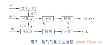 直接轉(zhuǎn)化方法主要有氫氣氣化、水蒸氣催化氣化方法。氫氣氣化方法以氫氣作為氣化劑,氫氣由焦炭—蒸汽—氧氣氣化制得(對應(yīng)氣化器A一路),煤氫氣氣化后(對應(yīng)氣化器B一路)經(jīng)脫酸得到的產(chǎn)物主要為甲烷、氫氣(過剩部分),經(jīng)分離最終得到甲烷,過剩氫氣與來自氣化器A一路的氫氣一起返回氣化器B作為煤氣化劑。氫氣氣化工藝流程見圖2。目前,l3本新能源產(chǎn)業(yè)技術(shù)綜合開發(fā)機構(gòu)(NEDO)正大力發(fā)展該項技術(shù),據(jù)報道氫氣氣化技術(shù)的熱效率比間接轉(zhuǎn)化方法高,造價也有望降低,從而進(jìn)一步提高SNG的競爭力[2]。