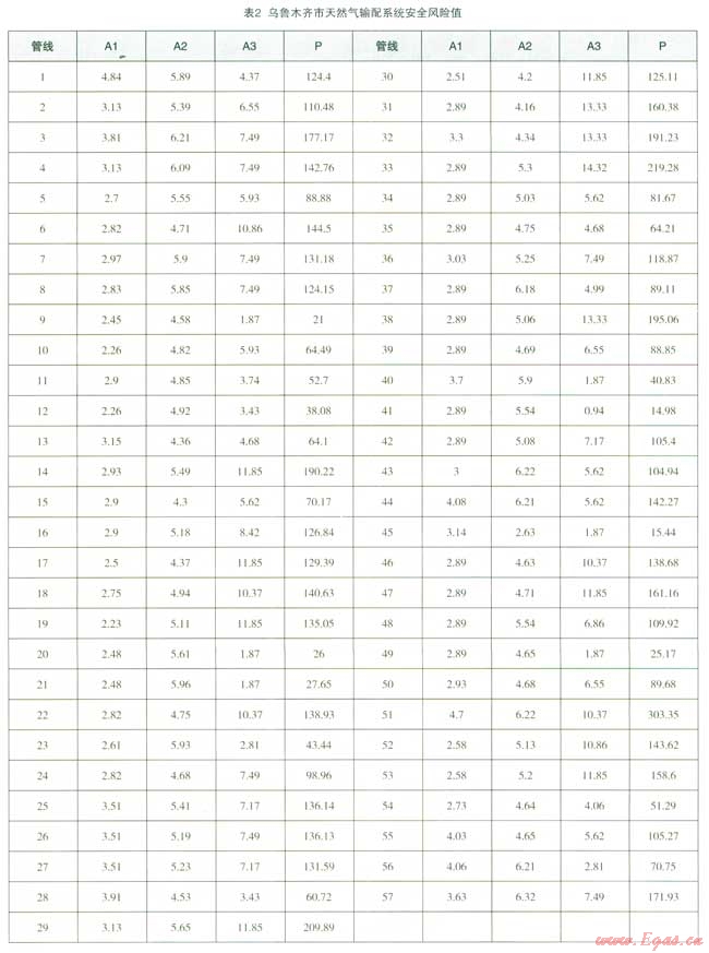 根據(jù)風(fēng)險(xiǎn)評(píng)估方法,計(jì)算出烏魯木齊市57條滅然氣管道的風(fēng)險(xiǎn)值(表2)。由表2可知,管網(wǎng)脆弱性指標(biāo)以1號(hào)管線最大,為4.84,其次是51號(hào)管線,為4.70,主要是因?yàn)楣芫€管輸氣體壓力大,管線使用年限較長(zhǎng),19號(hào)管線管輸氣體壓力小,最小埋深大管網(wǎng)脆弱性指標(biāo)最小,為2.23。事故誘因指標(biāo)以57號(hào)管線最大,為6.32,其次是51號(hào)管線,為6.22,主要是因?yàn)榻ㄖ┕?、地面活?dòng)情況和供水、排水沒(méi)施建設(shè)活動(dòng)較頻繁,15號(hào)管線位于郊區(qū),外界干擾少,事故誘因指標(biāo)最小,為2.63。事故后果指標(biāo)以3,號(hào)管線最大,為14.32,其次是38號(hào)管線,為13.33,主要是因?yàn)槿細(xì)夤芫W(wǎng)位于居住區(qū)、商業(yè)區(qū)內(nèi),人口密度和財(cái)產(chǎn)密度較高,泄漏危害嚴(yán)重;41號(hào)管線位于人煙稀少地區(qū),事故后果指標(biāo)最小,為0.94。全部管網(wǎng)風(fēng)險(xiǎn)平均值為112,1條天然氣管道風(fēng)險(xiǎn)評(píng)估值大于300,說(shuō)明有較高的風(fēng)險(xiǎn);2條天然氣管道風(fēng)險(xiǎn)評(píng)估值在200~300之間,說(shuō)明風(fēng)險(xiǎn)一般;54條天然氣管道風(fēng)險(xiǎn)值小于200,說(shuō)明相對(duì)安全。綜合以上,由于管道周圍運(yùn)行環(huán)境不同,其風(fēng)險(xiǎn)也是不一樣的,51號(hào)管段的脆弱性指標(biāo)、事故誘因指標(biāo)和事故后果指標(biāo)較大,知此管段的風(fēng)險(xiǎn)等級(jí)較高。