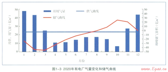 用以上方法計算得到:對于第一種情況“2020年有電廠”,平衡一年中各月不均勻用氣所需的儲氣量為70億m3;第二種情況“2020年無電廠,”季節(jié)調(diào)峰理論儲氣量53億m3。