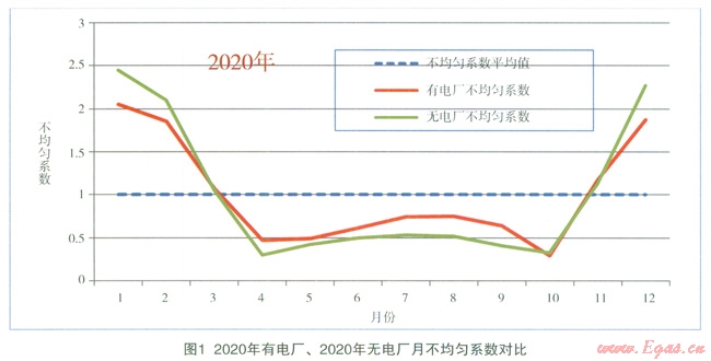 計算表明:預(yù)計到2020年,“有電廠”的最大月不均勻系數(shù)為2.05,“無電廠”為2.45,“有電廠”的最大月不均勻系數(shù)最小,“峰值”與“均值”的偏離程度最小,如圖1所示。