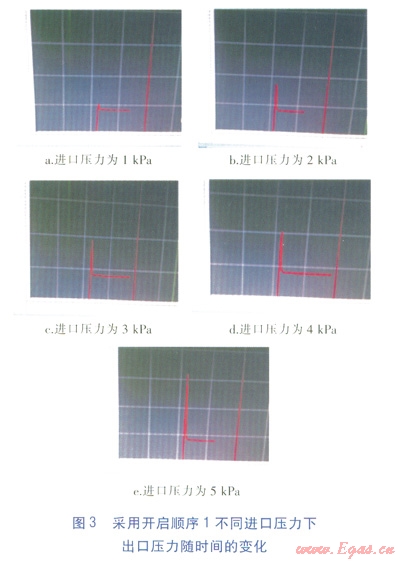 在不同進氣壓力p1(1、2、3、4、5kPa)下進行試驗,并記錄出口壓力p2的變化情況,見圖4,橫坐標表示時間,縱坐標表示p2。由圖4可知,采用開啟順序2時,出口壓力p2比較穩(wěn)定,隨著進口壓力p1升高,出口壓力p2仍然比較穩(wěn)定,沒有出現(xiàn)過沖現(xiàn)象。