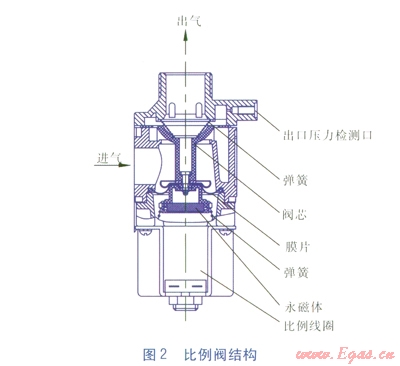 比例閥還具有穩(wěn)定燃氣壓力作用,當作用在壓力調(diào)節(jié)器膜片上的燃氣壓力增大時,膜片帶動閥芯向下運動減小相對開度,保證出口壓力的穩(wěn)定;反之,當作用在壓力調(diào)節(jié)器膜片上的燃氣壓力減小時,膜片帶動閥芯向上運動增大相對開度,保證出口壓力的穩(wěn)定。