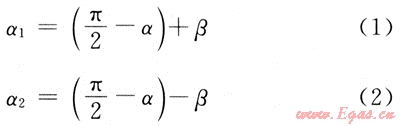 鉆井井斜角為α(α<90°)、地層的傾角為β、井眼軌跡方向與地層的走向相反和相同時,它們與地層的夾角分別為α1、α2,其計算公式分別為: