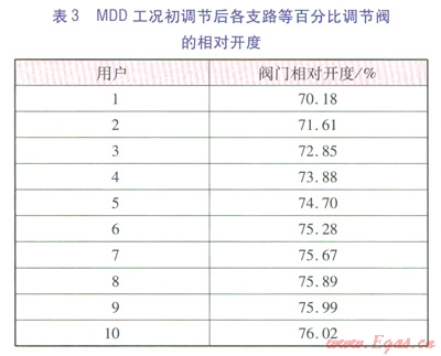 初調(diào)節(jié)后供回水壓力曲線比較平緩,說明各用戶資用壓頭平穩(wěn)下降,運(yùn)行條件得到了很大的改善。同時(shí),各用戶流量均達(dá)到了設(shè)計(jì)流量。此時(shí),管網(wǎng)用戶支路上等百分比調(diào)節(jié)閥的相對(duì)開度見表3。