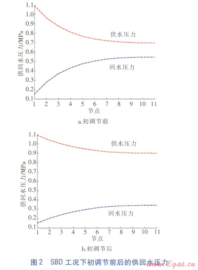 通過計(jì)算整個(gè)管網(wǎng)最不利熱用戶的壓力降,選擇水泵的壓頭為938.99kPa。利用Matlab軟件編程實(shí)現(xiàn)整個(gè)管網(wǎng)的運(yùn)行調(diào)節(jié)。SBD工況下初調(diào)節(jié)前、后的供回水壓力見圖2。