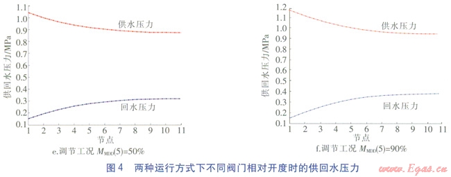 以用戶5所在支路上的閥門調(diào)節(jié)為例,對(duì)閥門相對(duì)開度為50%、90%及74.7%(設(shè)計(jì)工況下的閥門相對(duì)開度)的水力工況進(jìn)行分析比較。SBD工況的閥門相對(duì)開度用MSBD表示,MDD工況的閥門相對(duì)開度用MMDD表示。兩種運(yùn)行方式下不同閥門相對(duì)開度時(shí)的供回水壓力見圖4。