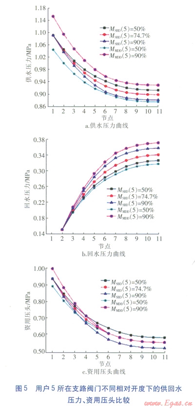 ②對(duì)于MDD工況,隨著閥門相對(duì)開度的增大,每個(gè)用戶的供回水壓力均增大;無(wú)論閥門相對(duì)開度如何變化,在所調(diào)節(jié)閥門支路之后的用戶的資用壓差未受影響;在所調(diào)節(jié)閥門支路之前的用戶(包括所調(diào)節(jié)的用戶)隨閥門相對(duì)開度的增大,資用壓差增大。